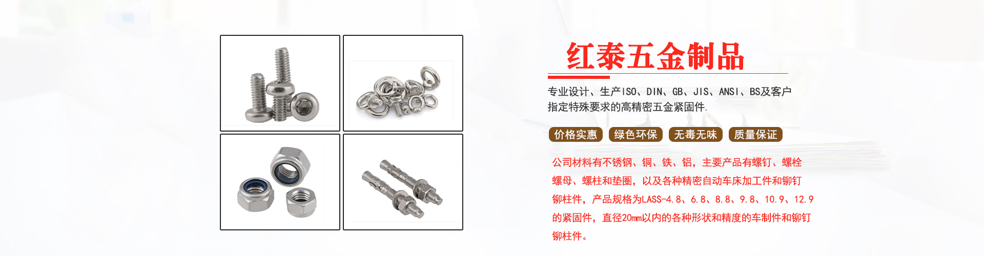 東莞市紅泰五金制品有限公司,公司占地六千多平方米,擁有五十多組螺絲機及六十臺自動車床設(shè)備。是一家專業(yè)設(shè)計、生產(chǎn)ISO、DIN、GB、JIS、ANSI、BS及客戶指定特殊要求的高精密五金緊固件的制造企業(yè)。
